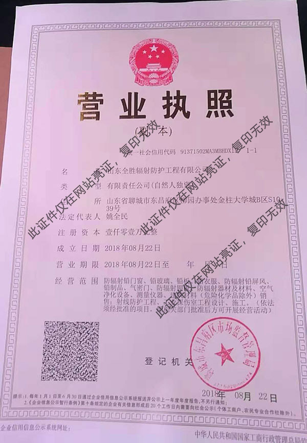 山东全胜辐射防护工程有限公司专业从事销售国产铅板、铅门、铅玻璃、铅锭、硫酸钡、铅屏风、探伤门、铅丝等,拥有专业的施工队伍,专业铅门窗,并对操作间进行专业施工。至开业以来我公司本着“信誉为主”的宗旨为广大客户服务,博得了大家的一至好评。公司以铅板,铅砖.铅玻璃.硫酸钡砂.防护门.加工为主,面向全国批发.销售。所使用材料,全部符合国家标准。所有铅制品均选用99.994%以上的铅锭加工制作,其铅锭选用1#铅(国标1300%以上)。可根据客户需要定尺长.宽.厚加工,宽度在1550以下,厚度在0.3M···...